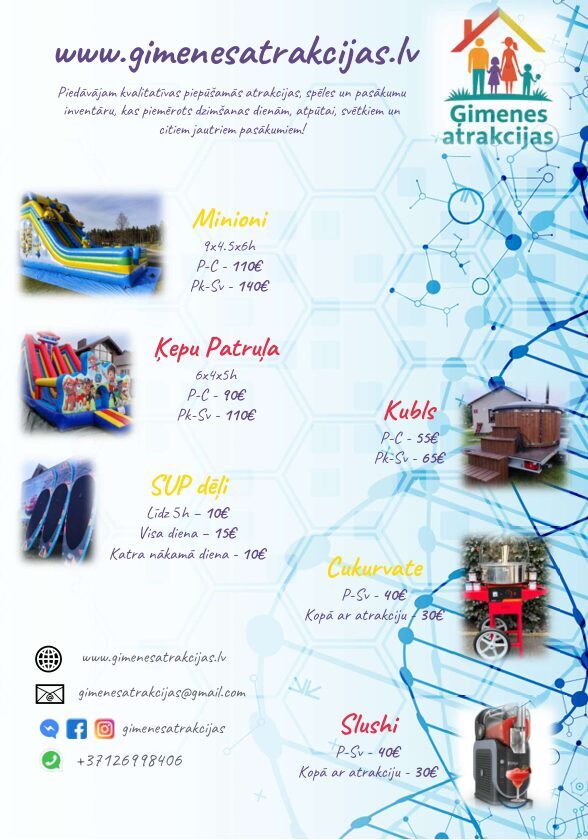 Laipni lūdzam Ģimenes Atrakcijās – vietā, kur sākas bērnu smiekli, kustība un īsta svētku burvība! Mēs piedāvājam kvalitatīvas piepūšamās atrakcijas, spēles un pasākumu inventāru, kas piemērots dzimšanas dienām, atpūtai, svētkiem un citām jautrām norisēm. Mēs ticam, ka īstie svētki sākas brīdī, kad bērni aizmirst par ikdienu un ļaujas iztēlei – lecot, slidinoties, rāpojot un smejoties no sirds.